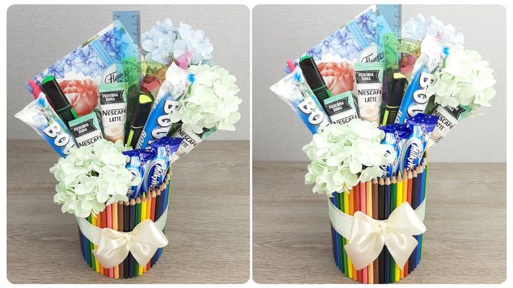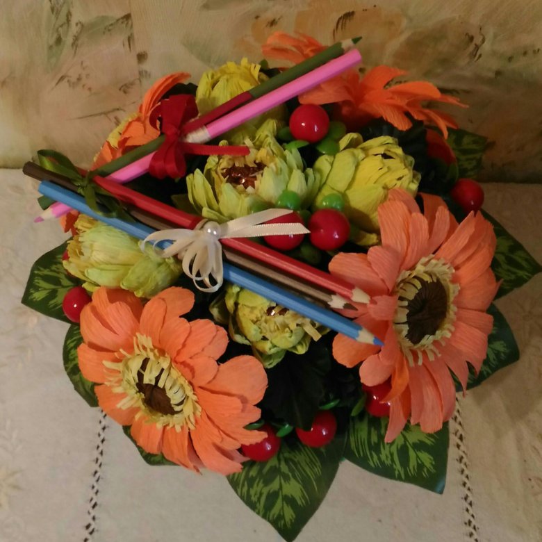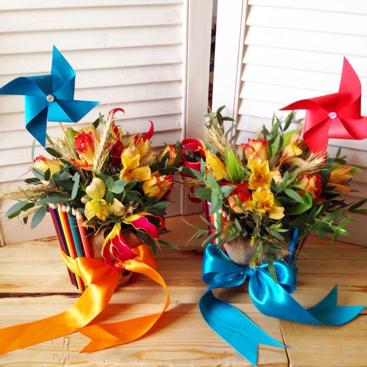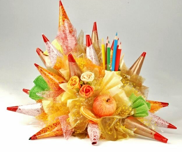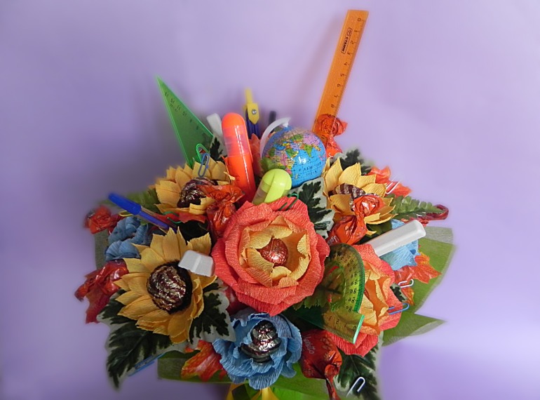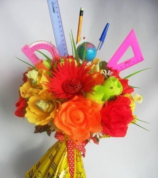 Охапку разноцветных роз с некрупными бутонами украсьте несколькими карандашами или ластиками контрастных оттенков. Глядя на такой букет, ощущаешь приближение осени и нового учебного года!