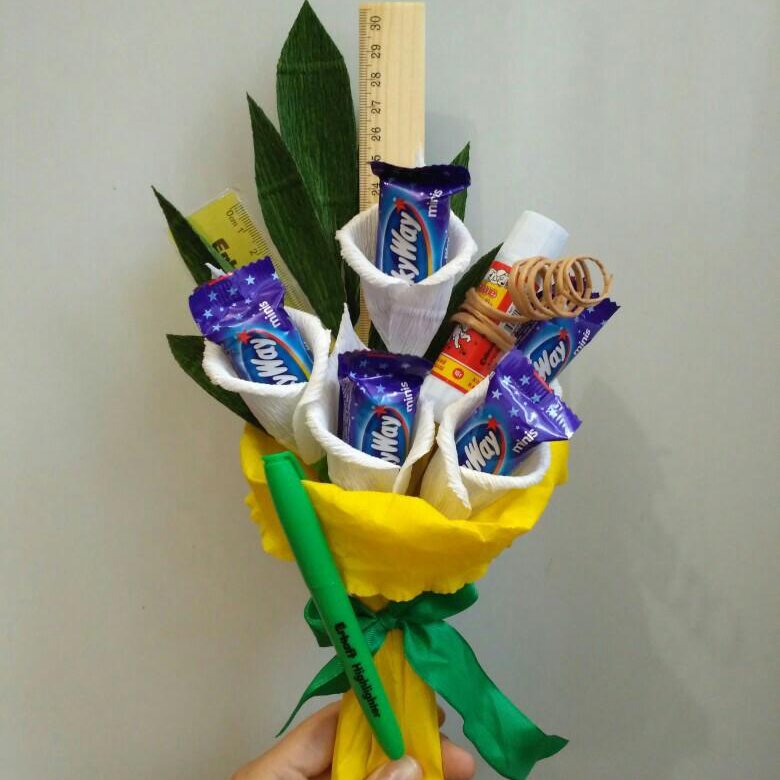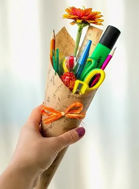 Такой милый букет не будет обделен вниманием. Благодаря своему компактному размеру он поместится даже в маленькой вазе. Перевяжите цветы бечевкой и упакуйте в крафт-бумагу. Фигурки, карандаши и линейки будут здесь также уместны.