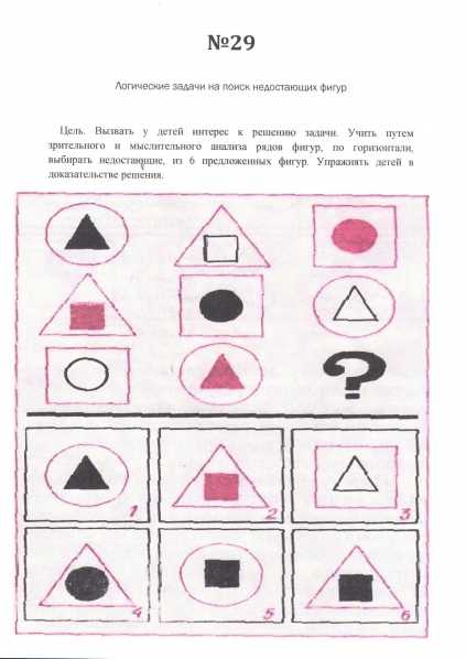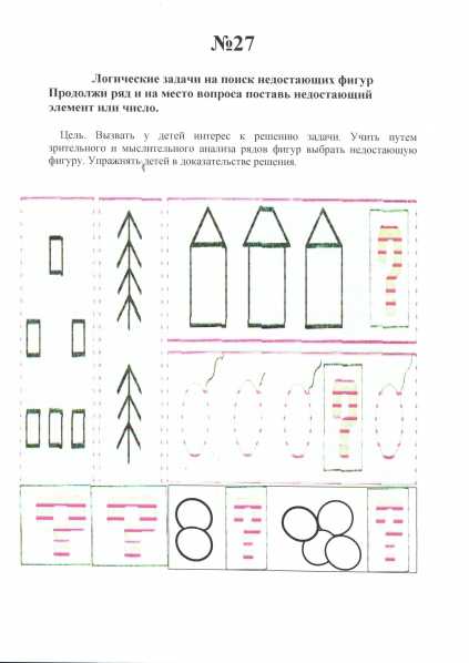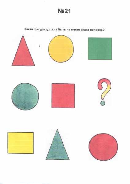 Це завдання на знаходження пропущеної фігури, продовження ряду фігур, на пошук чисел. Наприклад, „Яка з геометричних фігур зайва і чому?”, „Лабіринти”, „Знайди два однакових предмета”, „Продовж ряд зображень”.