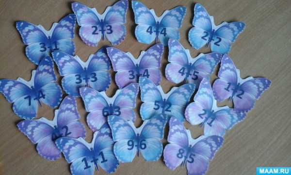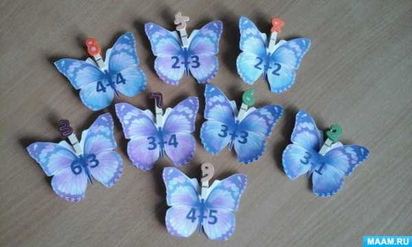 На метеликах потрібно вирішити приклади і за допомогою прищіпки з цифрами визначити правильну відповідь.