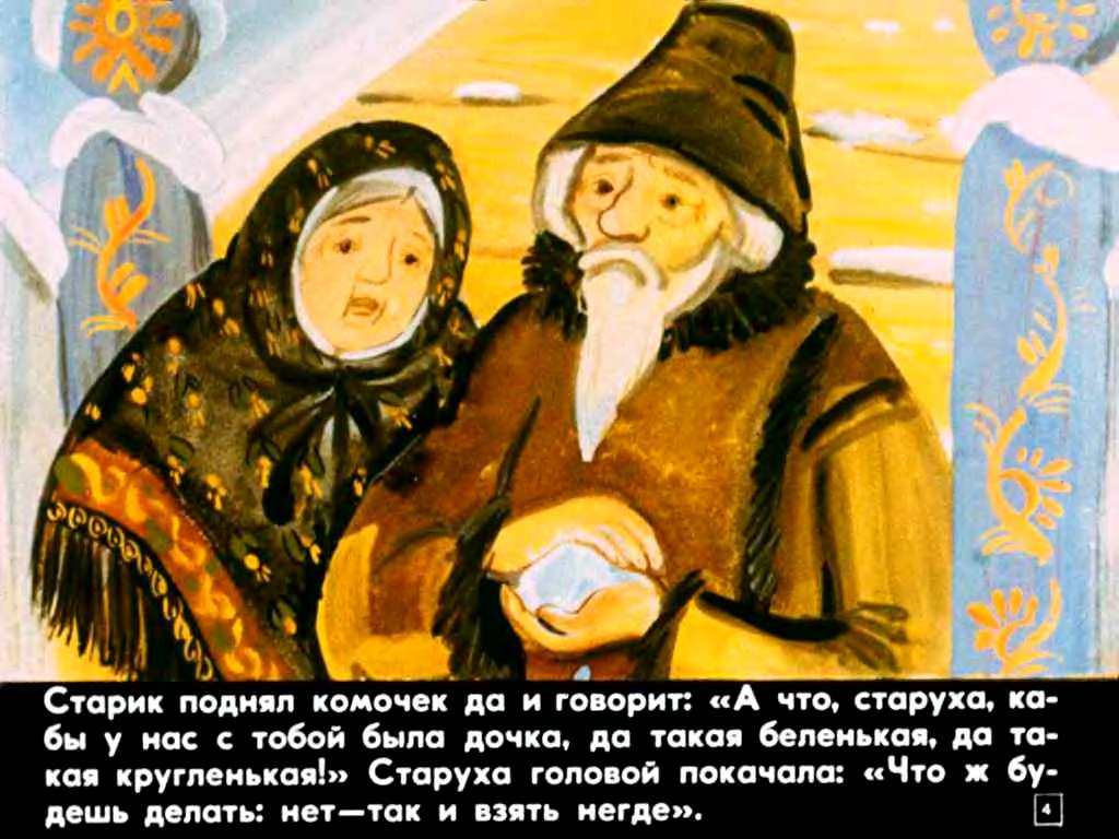 Жили-были старик со старухой, у них не было ни детей, ни внучат. Вот вышли они за ворота в праздник посмотреть на чужих ребят, как они из снегу комочки катают, в снежки играют. Старик поднял комочек да и говорит: