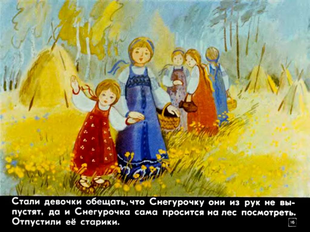 Пришло лето, стали ягоды поспевать, вот и зовут подружки Снегурочку в лес по ягодки. Старики и слышать не хотят, не пускают. Стали девочки обещать, что Снегурочки они из рук не выпустят, да и Снегурочка сама просится ягодок побрать да на лес посмотреть.