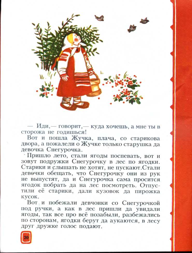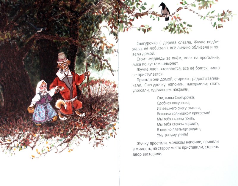 — Ау-ау, Жученька! Ау-ау, милая! Я здесь — девочка Снегурочка, из вешнего снегу скатана, вешним солнышком подрумянена, выпросили меня подруженьки у дедушки, у бабушки в лес по ягодки, в лес завели да и покинули. Хотел меня медведь унести, я не пошла с ним; хотел волк увести, я отказала ему; хотела лиса сманить, я в обман не далась; а с тобой.