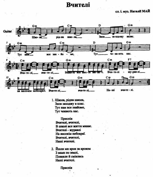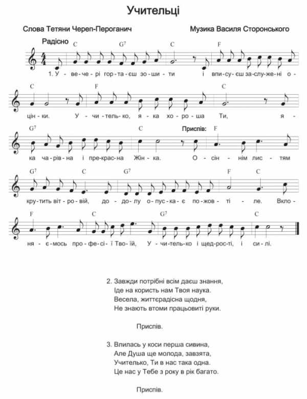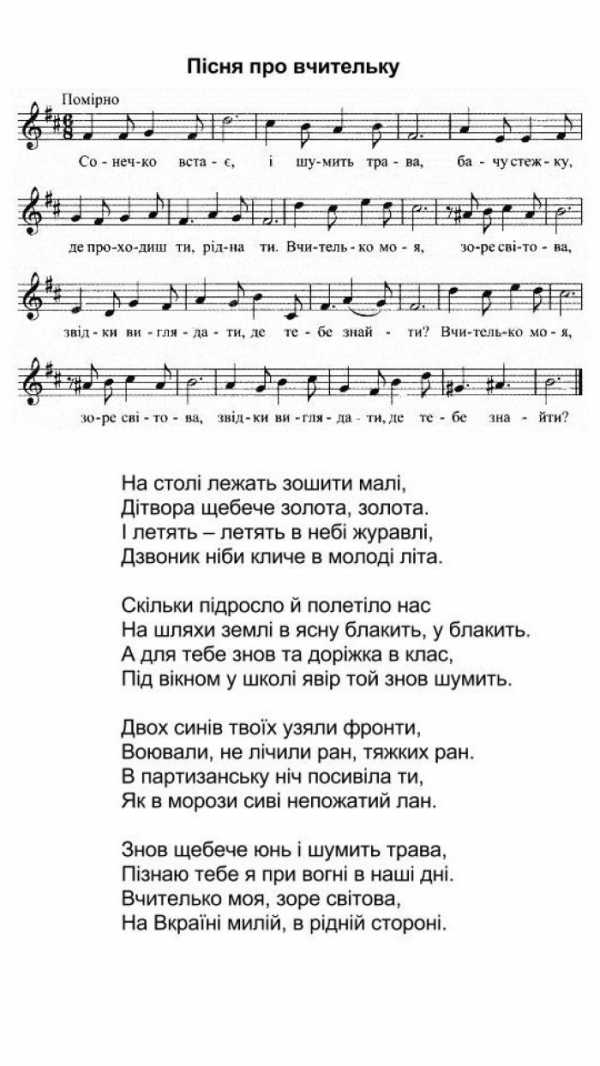 ___________ Дорогi вчителi! До Вас сьогоднi слова щирої шани, сердечної вдячностi. Ваша праця мудра i благородна. Розум, серце, душу, здоров’я впродовж усiх рокiв ви вiддаєте своїм вихованцям. Як мама, проводжаючи дiтей в дорогу, вiддає з рушником частинку свого серця, щоб зiгрiвало воно на життєвих перехрестях, так i ви передаєте з частинкою серця знання. Мабуть, велике воно, учительське серце, раз на стiльки вистачає його…
