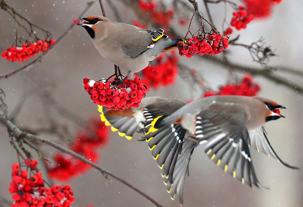 В зимнее время вместо теплолюбивых птиц появляется больше обитателей северных широт. Среди них наибольшими поклонниками рябины являются: