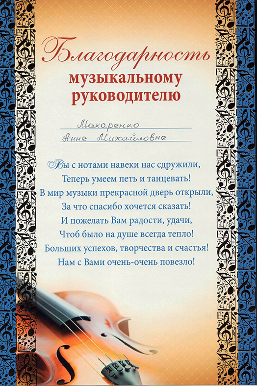 Нет счастливого детства без песен и музыки, а — тот самый человек, который каждый день наших детей превращал в великолепный танец веселых нот и сказочных мелодий. Уважаемый музыкальный руководитель, поздравляем вас с выпускным парней и желаем всегда брать высокие ноты успеха, сочинять свою мелодию счастья и любви. Также желаем прекрасных идей для работы, искренней радости деток в тональности каждого дня и большого вдохновения для вашего сердца.
