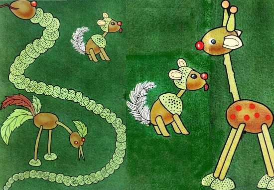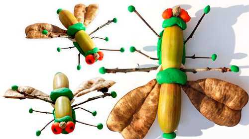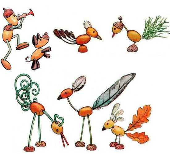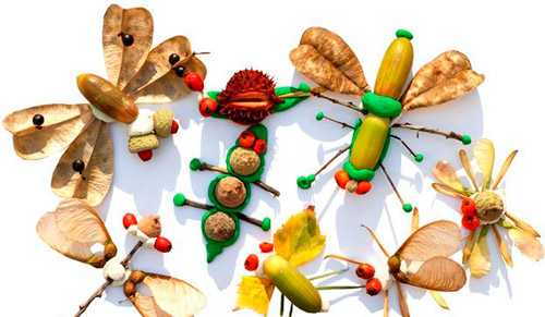Маленьким детям нравится изготавливать поделки из природного материала. Причем им интересен не только результат, но и сам процесс. Малыши учатся подбирать различные элементы по форме и цвету, составлять из них фигурки птиц, животных, насекомых, людей и даже целые композиции.