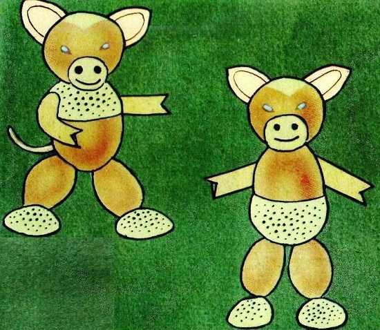 Большую шишку окрашивают в розовый цвет и дают ей просохнуть. Узкий конец большой шишки — это голова поросенка. Со второй шишки снимаются самый большие чешуйки — это будут уши поросенка. Они клеятся к голове, а из проволоки делается закрученный хвост и фиксируется на шишке. С помощью пластилина делаются глаза и пятачок, а также копыта поросенка. Готовую поделку устанавливают на подставку.