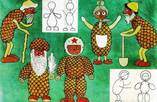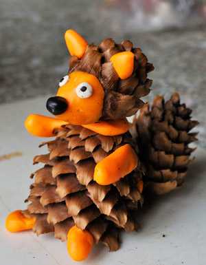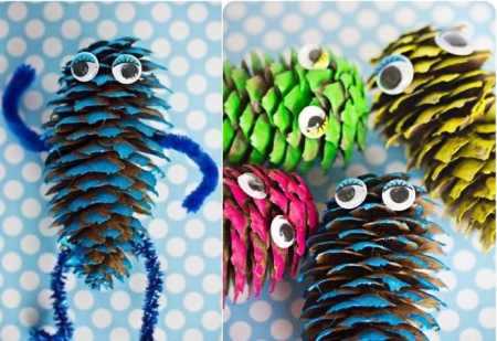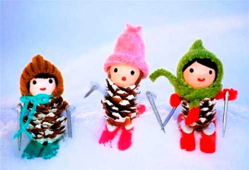 Из шишек можно сделать много разных игрушек, включая человечков, зверей и птиц. Прежде чем использовать шишки в поделках, нужно дать им несколько дней просохнуть при комнатной температура, так как высохнув они раскрываются. Однако, если вы хотите сохранить ее первоначальный вид, то нужно поместить шишку в столярный клей и дать ей высохнуть.