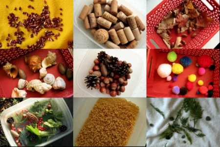 Ракушки, камушки красивой формы, каштаны, сухие листья и цветы, желуди, колоски, мох, шишки и хвоя, древесная кора, отломанные палочки. Такие материалы как цветы и листья необходимо предварительно высушить. Для этого их помещают между листами книг, плотно закрывают и дают там полежать несколько дней. Если этого не сделать, они могут потерять не только свою структура, но и форму.
