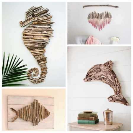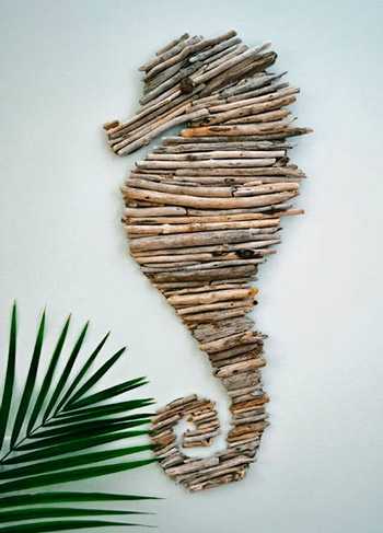 Например, для украшения старого зеркала можно использовать морские и пресноводные ракушки в сочетании с гладкими камушками. А из деревянных элементов с ровной поверхностью и веток с причудливой формой можно сделать своими руками красивые столики, стулья, полки, вешалки, панно на стену.