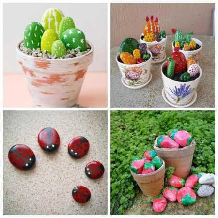 Вироби з каменю на підвіконні гості сприймуть як справжні кактуси. За такою ж схемою зробіть сонечок або кошик з полуницею.